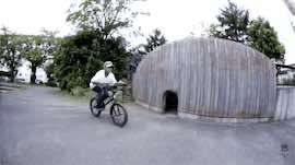 BMXの真上に着地出来る様にしてハンドルとキャッチしにいきます。