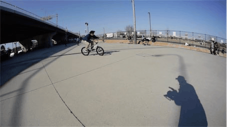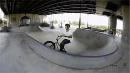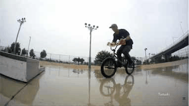 後輪を滑らせながら180度回った後、飛んで180度回るトリックです。